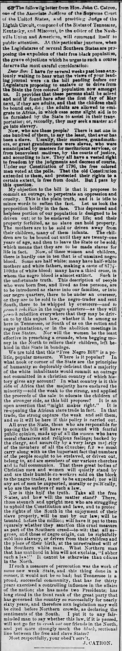 Catron supported slavery and sided with the majority in the Dred Scott v. Sandford case (exchanging letters with president-elect James Buchanan in February 1857).[12] However, he opposed secession and urged Tennessee to remain with the Union. For a brief time after Tennessee seceded from the Union but prior to Nashville being occupied by Federal troops, Catron left his residence in Nashville and temporarily lived in Louisville, Kentucky.