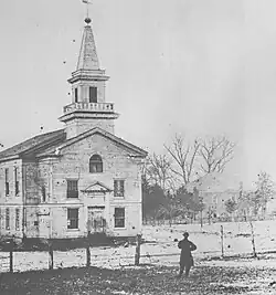 On the early morning of October 18, 1864, Captain Richard Montjoy led a contingent of at least 75 men from Company D of Mosby's command on a nocturnal raid into Falls Church.[10] The attack was initially successful, capturing several Union prisoners and a number of horses. However, the element of surprise was lost when members of the Home Guard blew a hunting horn as a warning to alert nearby Federal troops.[11]