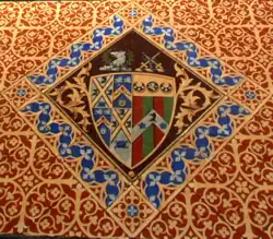 Coat of arms of John Dunn-Gardner on tiled floor the choir of Ely Cathedral, Cambridgeshire, as one of the benefactors to the restoration of the Cathedral. Gardener quartering Dunn impaling Lawson[2]