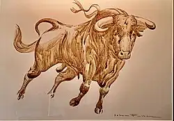 Painting of a bull, painted using the blood of a bull killed in bullfighting by John Fulton