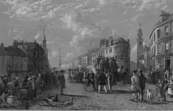 Burns was a daily visitor to Goldie's house during the time in 1786 that his manuscripts were at the printing works of John Wilson and he corrected the proofs there and wrote many letters, meeting future patrons as subscribers to his first published work, the Kilmarnock volume.[23][10][27] Goldie lived in the second flat of the building occupied by Messrs. Stewart who were ironmongers at the Cross.[27] Next door was the home of Baillie Gregory and Burns also visited their flat on occasions to work on his proofs as well as to listen to Mrs Gregory playing one of the few pianos to be found in the town at that time.[27]