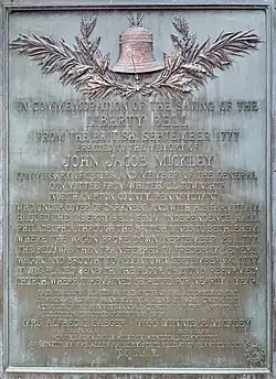 On November 19, 1908, the Liberty Bell Chapter of the Daughters of the American Revolution unveiled the Saving of the Liberty Bell Plaque, describing the efforts of Mickley and Leaser, at Zion Reformed Church in Allentown, Pennsylvania.[7] The plaque was unveiled by a descendant, nine-year old Edwin John Jacob Mickley.[8]