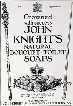 In 1817, John Knight Soap Works was officially established in the industrial area of Wapping, East London. The company was renamed John Knight & Sons when five sons joined the business in the 1840s. For decades, Knight provided candles and washing soaps to the royal family in London. In recognition, John Knight & Sons were awarded a Royal Warrant that officially branded the company as Soap Makers to King Edward VII, in 1903. It was also during this year that the name of Primrose Soap was changed to The Royal Primrose Soap. In 1906, the soap and candle company went public as John Knight, Ltd.[5]