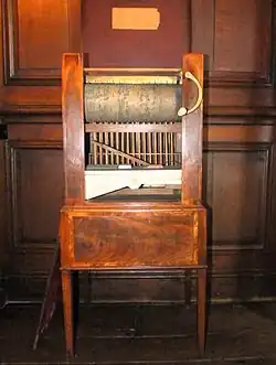 - The Lancaster Organ with three barrels. Built c.1790. Each barrel in pinned with 10 airs. There are four stops[20]