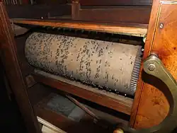 According to one source, Handel respected Langshaw's work.[1][20] However, Langshaw's main involvement with Handel's music appears to have begun after the composer's death in 1759 when he became involved in a project with John Christopher Smith. Smith, who is best known as the blind composer's amanuensis, collaborated with John Langshaw in transcribing a selection of Handel's works for chamber barrel organ. It is surmised that Langshaw's pinning of Handel's music reflects the actual way the composer played, thus making the barrels subjects of academic study.[21] Long the surviving Handel transcriptions is music from the organ concertos. As the composer (a noted organist) tended to "ad lib" in this repertoire,[19] there is scope for using barrel organs to reconstruct the original ornamentation, something which is not preserved in the printed versions. For example, the organist Richard Egarr, in his recording of the opus 4 set used ornaments preserved on a barrel organ in the Colt collection. This presents a highly ornamented version of Handel's music.[22][23]