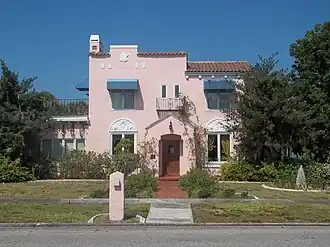 It is a two-story, frame residence covered with stucco, upon a concrete foundation. It has a gable roof with barrel tile sections and it has flat roof sections. Some shallow eaves are supported by simple wood brackets. The property also includes a non-contributing garage.[2]