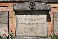 Mr Maitland’s last illness was a rapid one, and, as he usually enjoyed good health, and seemed to possess a robust constitution, his death came with sudden and stunning surprise on his numerous friends and the public at large as mentioned in several obituaries.[4][5][2] On Tuesday, 29 August 1865, he attended to his official duties in apparent health. Returning in the afternoon to his residence— that summer at Swinton Bank, near Peebles—he complained of what, for the three following days, appeared to be influenza. On Saturday, however, this illness assumed a more serious aspect; and, with occasional interruptions of his consciousness, he sank beneath the attack, and on Wednesday, 6 September, breathed his last. He was buried in the Grange Cemetery, near the grave of Chalmers, by the north wall.[1] he headstone gives dates which agree with Disruption Worthies rather than the dates in Burke's Peerage. William S. Anderson, College Curator and Office Caretaker, dedicated his A Guide to the Free Church of Scotland College and Offices to John Maitland. It also features Maitland's portrait from the Disruption painting on the front cover showing Maitland holding the plan of the Free Church Offices with Mr David Cousin, the architect. The Guide also has a photograph of Norman MacBeth's painting of Maitland on page 32.[6]