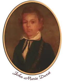 John Marie Durst was born in Arkansas Post on February 4, 1797. He was one of eight children, four boys and four girls, born to Jacob and Anna Agnes (Schesser) Durst. His brother Isaac was also given the first name of John, which was a custom among many ethnic Germans. His father Jacob was born in Shenandoah County, Virginia in 1754 as the first generation in North America. Jacob's father Abraham Derst had spelled the family name with an "e". Paternal grandfather Abraham Derst was born in Worms-Pfeddersheim, Germany in 1725, and was the immigrant ancestor to Virginia. Abraham's own father, Abraham Jacob Derst, was born and died in Germany. When John Marie was two years old, his mother died.