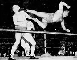 Murphy was a Doctor of Osteopathic Medicine, having been graduated from the Massachusetts College of Osteopathy, but he never practiced.[1] Instead, he was a professional wrestler in the 1930s and 1940s, mostly competing in the Northeastern United States, sometimes billed as "Dr. John (Dropkick) Murphy".[2] Murphy competed in matches, some promoted by Paul Bowser and Jack Pfefer, at places and venues including Portland, Maine, the Boston Arena and Mechanics Hall in Boston, Massachusetts, The Mosque (a roller rink)[3] in Bridgeport, Connecticut, the Rex Arena in Lowell, Massachusetts, the Philadelphia Arena, the Convention Hall on Line Street[4] in Camden, New Jersey, the Grand Olympic Auditorium in Los Angeles, the Montreal Forum, the Opera House in Newark, New Jersey, the Ridgewood Grove Sports Club[5] in Ridgewood, Queens, New York City, the Fort Hamilton Arena in Brooklyn, New York City[2][6] and St. Nicholas Palace (also called the Royal Windsor Palace) and Hippodrome, in Manhattan, New York City.[7]