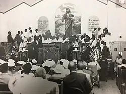 Robinson was born in Washington, D.C., on February 18, 1912.[2] Eight years later he and his four siblings were effectively orphaned when their mother died and their father abandoned the family.[3] Adopted by his maternal grandparents, he attended public schools, but dropped out before completing junior high.[2] While still in school he began to make small paintings while doing part-time evening work in a nearby automotive service station where his grandfather was a night watchman.[1]: 12 Having seen some of these paintings, the chauffeur of one of the station's clients borrowed a few and showed them to his sister. She showed them to an acquaintance, James V. Herring, then head of the art department at Howard University, and he arranged for Robinson to study under a Howard art teacher, James A. Porter, in return for light cleaning chores.[4] Financial need kept Robinson from working with Porter as long was he wished, but, as he later said, "what I learned at Howard under Professors Herring and Porter was the basis of my efforts in art."[1]: 12 After resuming both day and evening jobs, he nonetheless continued to paint, as he later said, whenever and wherever he could, "painting everything from church murals to door decorations."[1]: 12 He made his first mural when he was 17, a depiction of Christ at Gethsemane, at the Emmanuel Baptist Church in Anacostia,[5] where his grandparents had moved in 1929. This commission led to others, all within the African-American neighborhoods of the city.[4]