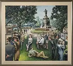 During the 1930s he obtained full-time employment first in the Civilian Conservation Corps and then as a laborer at the Washington Navy Yard. In 1935 he found work at St. Elizabeths Hospital, which, like the Navy Yard, lay not far from his home in Anacostia.[1]: 13 In each of these occupations, he painted when not working and, particularly at St. Elizabeths, was able to sell portraits to some of his fellow workers. Like other African-American artists in segregated Washington, he was unable to find a commercial gallery that would show his work, but, beginning in 1938, he was an eager participant in an annual series of outdoor exhibits sponsored by the Times-Herald newspaper. At these art fairs he would both sell his paintings and make what he called "minute sketches" of passersby charging thirty-five cents each. He befriended area artists and made connections that led to part-time work making backgrounds for a photographic portrait studio.[1]: 13 [note 1] Shown at left is a painting Robinson made in 1946 showing the crowd at the fair, held that year in President's Park (now called Lafayette Square).[11]