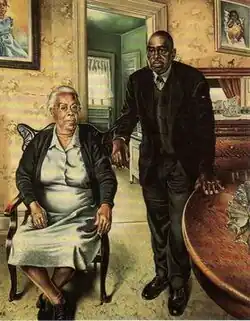 In 1943 a small, nonprofit art gallery opened within a private home near Howard University. Called the Barnett Aden Gallery, it broke with tradition by showing works by African-American as well as white artists.[12] In February 1945 Robinson's paintings were included in a group show held there.[12]: 193 [note 2][note 3] Later that year he won an award for his painting, "Mr and Mrs Barton," at the fourth annual Exhibition of Paintings held at Atlanta University.[7] This painting, shown at right, is a portrait of the artist's grandparents.