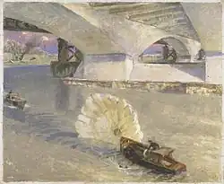 After the war Platt exhibited at the New English Art Club, for the British Council and in 1922 won a gold medal at the International Print Makers' Exhibition organised by the California Society of Printmakers.[9][10][11] As well as designing several posters for London Underground, he continued to teach. Platt taught at the Harrogate School of Art throughout 1919, the Derby School of Art in 1920 and was Head of the Department of Fine Art at Edinburgh College of Art between 1920 and 1923, before becoming Principal of the Leicester School of Art from 1923 until 1929, when he moved to London to become head of Blackheath School of Art.[8][5] Throughout the 1930s, whilst teaching at Blackheath, Platt produced a number of highly regarded woodcuts, prints and seascapes. He published numerous articles and the book Colour Woodcuts: a Book of Reproductions and a Handbook of Method,(1938).[4] From 1938 till 1953, Platt was the President of the Society of Graver Painters in Colour.[1][12]