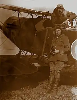 He was then attached to No. 62 Squadron, Royal Flying Corps, to fly in the Bristol F.2b two-seater fighter.[2] No. 62 Squadron moved to France in January 1918,[14] where Gordon was paired with Captain Bill Staton as his pilot.[2] Gordon gained his first aerial victory (Staton's third[15]) on 21 March 1918, and followed it with a triple victory on the 26th. Gordon was promoted to lieutenant on 28 March 1918.[16] His fifth victory, which earned him "ace" status, came on 1 April.[1] The next day Major-General John Salmond, Commander of the RAF in the Field, authorized his recommendation for the award of the Military Cross.[17]