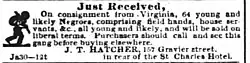 Hatcher was selling at the Forks of the Road slave market outside Natchez, Mississippi in 1846, offering "newly imported Maryland Negroes".[3] An ad of 1847 advertised that Hatcher's stand had ties to a "trading house" in New Orleans allowing on-demand delivery of special orders of particular types of human beings.[4] C. F. and J. T. Hatcher were residents of New Orleans, Louisiana at the time of the 1850 U.S. census. They lived in the same household (likely a boarding house) and both listed their occupation as "trader".[5]