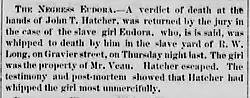 As reported in the Anti-Slavery Bugle of Ohio in 1859, "John T. Hatcher, keeper of a slave yard in New Orleans, whipped a negro woman named Eudora for an hour and a quarter, on [December 23, 1858], from the effects of which she died in a short time. Hatcher fled, and at last account had not been arrested."[6] French abolitionist Pierre-Suzanne-Augustin Cochin covered the murder in his book L'Abolition de l'esclavage, republishing an account in the New Orleans Bee that "caused some sensation in that city". The whipping took place at R. W. Long's slave pen on Gravier Street, and "Mr. Harvey deposed that the cracking of the whip was heard during about an hour and a half, with one interruption of five or six minutes."[7] Hatcher was apprehended in St. Louis, Missouri, in March 1859.[8] After trying and failing to bribe the arresting officers to let him go,[9] Hatcher was later released from custody by the Governor of Missouri at the behest of the Governor of Louisiana, which the St. Louis Globe-Democrat said "strikingly indicates the power of money to protect an accused man".[10]
