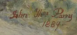 J.T. Parry typically signed his paintings with his full name and, on occasion, appended them with (ap Idwal). In one notable instance, a Welsh newspaper article from 1887 describes how a stage production of Rhys Lewis had been received by an audience in Liverpool and it referred to Parry as "Ap Venus."[19] The article also mentioned that a Liverpool newspaper praised the play's performance and scenic artwork. This remains one of the few known instance of "Ap Venus"[20] appearing in print.[21] Additionally, a decorative fireplace tile is inscribed "J.T. Parry (Ap Venus),"[22] making this the only known occurrence of the name appearing on his work.