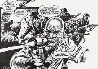 Wagner then quit editorial and returned to freelance writing.[9] In 1976–77 he wrote "Darkie's Mob" for Battle, a violent series about a renegade British captain leading a group of lost soldiers in a personal war against the Japanese in Burma during World War II, drawn by Mike Western, which became one of the comic's most popular strips,[16] although Wagner has since said he regrets "some of the jingoistic, racist language" used.[17] A collected edition was published by Titan Books in 2011.[18] Other strips he wrote for Battle included "Joe Two Beans" (1977), about a mute Native American soldier in the Pacific Campaign, drawn by Eric Bradbury, and the naval series "HMS Nightshade" (1978–79), drawn by Western.[16] For Mills' short-lived, controversial title Action he scripted the boxing strip "Blackjack".[19] During this time he shared a flat on Camberwell New Road in London with future 2000 AD editor Steve MacManus.[6]