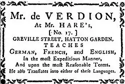 de Verdion taught languages to various prominent men. He taught German to Edward Gibbon, who went on to author The History of the Decline and Fall of the Roman Empire.[8] He also taught English to the Prussian ambassador and German to William Cavendish-Bentinck, 3rd Duke of Portland.[2] de Verdion was an admirer of John Wesley.[9][10]