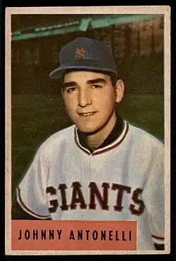 John August Antonelli[1] (April 12, 1930 – February 28, 2020) was an American professional baseball player, a left-handed starting pitcher who played for the Boston / Milwaukee Braves, New York / San Francisco Giants, and Cleveland Indians between 1948 and 1961. Noted at the outset of his pro career as the recipient of the biggest bonus in baseball history when he signed with the Braves for $52,000 in 1948, he later became a six-time National League (NL) All-Star, a two-time 20-game-winner, and an important member of the 1954 World Series champion Giants' pitching staff. He batted left-handed, stood 6 feet 1 inch (1.85 m) tall and weighed 185 pounds (84 kg).[1] He was the first person born in the 1930s to make his MLB debut.