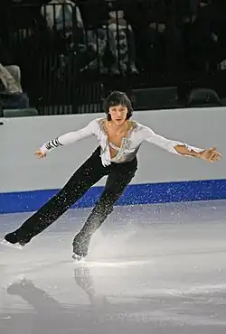 Weir won the NHK Trophy,[25] his first Grand Prix title and the first time he competed under the ISU Judging System (IJS). He earned 146.20 points in the free skate and 220.25 points overall, beating his runner-up Timothy Goebel by over 20 points.[58][59] Weir's trip to Japan marked the first time he came "face-to-face"[60] with Johnny's Angels, a group of figure skating fans who supported Weir emotionally and financially.[61] He also won Trophee Bompard[25] with a score of 208.10 points, despite coming in second in the free skate, behind French skater and European champion Brian Joubert, who came in second place overall.[62] Weir "skated elegantly"[62] in his free skate, but doubled his three planned triples in the second half of his program, which hurt his technical scores.[62] He again did not include any quadruple jumps, choosing instead to emphasize his artistry, spins, and pirouettes.[63] Weir later said that his win in Paris "signaled my ascendancy on the international stage".[64]
