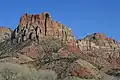 Johnson Mountain is located immediately southeast of Springdale, towering 2,200 feet (670 meters) above the town and the floor of Zion Canyon. It is wedged between the North and East Forks of the Virgin River which drain precipitation runoff from this mountain. Its nearest higher neighbor is The Watchman, 0.8 mi (1.3 km) to the north-northeast, and Mount Kinesava is positioned 2.94 mi (4.73 km) directly across the canyon to the northwest.[1] Shunesburg Mountain is set 2 mi (3.2 km) to the southeast, directly across the mouth of Parunuweap Canyon. This feature's name was officially adopted in 1934 by the U.S. Board on Geographic Names. It is named for Nephi Johnson (1833–1919), a Mormon missionary, interpreter, explorer, and the first white man to visit Zion Canyon.[3] In 1858 a Paiute guide by the name of Nauguts led Nephi into the Zion Canyon area of the upper Virgin River.[4] Johnson wrote a favorable report about the agricultural potential of the upper Virgin River basin, where he founded the town of Virgin.