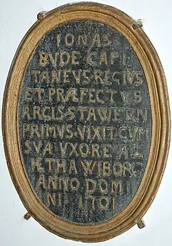 Jonas Budde or Jonas Olufsen Bude, (23 January 1644 – 1710) served a distinguished career in the military of Denmark-Norway, including service at various Norwegian fortresses during the extended period of hostility between Sweden and Denmark-Norway. He served as an officer of Fredrikstad Fortress garrison from 1676 through 1681 (including the period of the Gyldenløve War), was the commanding officer of Christiansfjeld fortress from October 24, 1684, to February 2, 1688, and was lieutenant colonel (Oberstløjtnant) and commanding officer of Stavern Fortress from November 3, 1689, until his death in 1710 at sixty six years of age.[1]