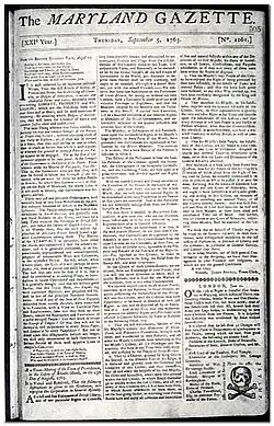 Green, a born troublemaker, hated the Stamp Act, which among other things directly taxed his newspaper. Refusing to pay, he published the Gazette with what was then a blaring headline: "The Maryland Gazette Expiring: In Uncertain Hopes of a Resurrection to Life Again." Green wrote that because of the Stamp Act, the newspaper "will not any longer be published." In the bottom right-hand corner of the page, where the tax stamp should have been placed, there appeared instead a skull and crossbones. Calmer heads persuaded Green to return to publishing as part of the struggle against tyranny, and he later resumed publication under this banner headline: "An Apparition of the late Maryland Gazette, which is not dead, but only sleepeth." Defenders of this newspaper's claim as "the oldest in the nation" say this brief interruption of publication was not a business decision as much as a deliberate political statement by a determined and courageous publisher. [3]