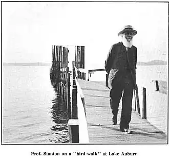 Stanton taught at Bates from 1863 until his death in 1918. He taught Greek and Latin, led debates and taught a popular class in ornithology. Stanton maintained a correspondence with Charles Darwin and some of Darwin's letters have survived.[2] The local Stanton Bird Club is still active and owns the Thorncrag Nature Sanctuary. The "Stanton Ride", where Stanton paid to have horses and carriages take the freshman class on a picnic where he would tell them the history of the college, continued as a tradition for over 100 years. Referred to by students as "Uncle Johnny" and by college president George C. Chase as "the spirit of Bates", Stanton refused to leave Bates for any other colleges and remains one of the school's most influential professors to this day. Stanton was influential in creating a strong debate tradition at Bates with the creation of debate prizes and supporting the literary and debate societies, such as the Polymnian and Eurosophian Societies in the early years of the school.[3] Stanton's large collection of bird specimens was mainly sent from Bates to the Maine State Museum in 1980, but several specimens remain on campus.[4]