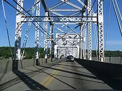Construction of a 1,600-foot (490 m)-long steel multi-girder replacement bridge just upstream of the original bridge began in September 2013.[5][6][7][8][9] The new bridge, which opened to traffic on October 20, 2015,[10][11][12][13] has four 11-foot (3.4 m)-wide traffic lanes (2 in each direction), one 4-foot (1.2 m)-wide median, one 4-foot (1.2 m)-wide shoulder on each side of the roadway, and a 5-foot (1.5 m)-wide ADA-compliant sidewalk on the bridge's southern side.[13][14]