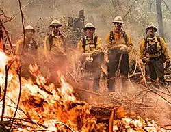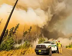 ![]() Fire personnel confer under a billowing column of smoke from the Jones Fire, August 2017 | |