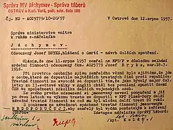 Finally he was moved to a prison in Ostrov nad Ohří in western Bohemia and made to work in a uranium mine called Rovnost (The Czech word for "Equality"). Here prisoners were paid a small wage for their work. Bryks worked hard, exceeding his work quotas, and sent his wage to help support his sick father and his wife and daughter. But in December 1955, the Communists banned Bryks from sending money to his family.[1]