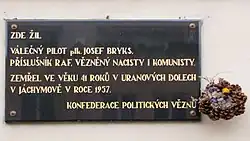 After his conviction, Bryks was held first in Pankrác, in the same prison where the Gestapo had held him in 1944. On 17 August 1949, he was transferred to Bory prison in Plzeň.[1] On 18 April, the prison authorities announced that they had uncovered a plan for a prison uprising and mass escape.[6] Bryks was among those accused of the allaged plot. He was tried on 11 May 1950 and found guilty. His sentence was extended with 20 years hard labour and he was fined Kčs 20,000.[1] His wife protested to the General Secretary of the Communist Party of Czechoslovakia, Rudolf Slánský,[2] but received no answer.[1]