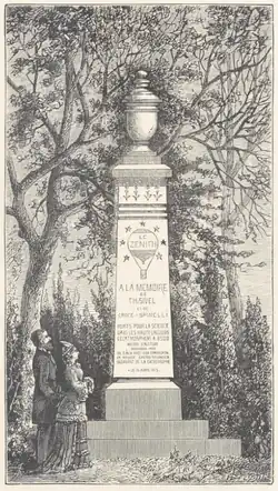 After the funeral of Crocé-Spinelli and Sivel, the French Society of Aerial Navigation and several major newspapers announced a public fundraising campaign to help the families of the deceased and to install a memorial at the crash site of the balloon. This monument, designed by Albert Tissandier, was solemnly unveiled on March 25, 1881. It took the form of a large stone obelisk. On April 4, 2017, it was added to France's historical memory list.[21]