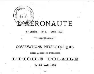 6. ^ "F. Petard "Physiological observations made aboard the aerostat 'L'Étoile polaire' on April 26, 1873", journal "L'Aéronaute" pp.117-122". Archived from the original on 2 December 2021. Retrieved 18 June 2022.