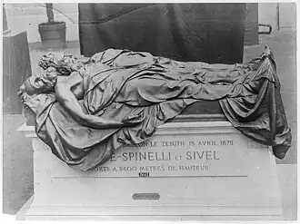In 1878, a sculptural composition depicting the scientists was ceremoniously installed at the Père Lachaise Cemetery. The composition was created by the French sculptor Alphonse Dumilatre. According to the sculptor's idea, Crocé-Spinelli and Sivel lie side by side, holding hands. This pose was how their bodies were found by local peasants, the first to arrive at the Zenith crash site. This unique sculpture on the scientists' tomb attracts thousands of tourists who visit the Père Lachaise Cemetery every year.