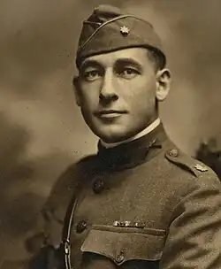 Patch's first assignment as a lieutenant was with the 10th Infantry Regiment in Panama.[13] From 1914 to 1917, he served with the 26th Infantry Regiment in Texas during the Mexican Border War. While in Texas, he established a temporary military base in Kingsville, Texas which has been commemorated as Camp Kingsville.[16] During World War I, he served with the 18th Infantry Regiment and participated in extensive combat in France.[13] He advanced to major as commander of the regiment's 1st Battalion, and received the Distinguished Service Cross for his heroism while leading his command during combat near Chaudun in July 1918.[13][17][b] He was wounded during this attack, and convalesced at the base hospital in Bordeaux; news articles from September 1918 indicated that he was shot in the right shoulder, with the bullet passing down his right side and through his lung.[19] From December 1918 to June 1919, Patch commanded 1st Battalion, 805th Pioneer Infantry as it conducted post-war duty in France that included identifying and stockpiling ammunition and other materiel so it could be destroyed or transported back to the United States.[20]