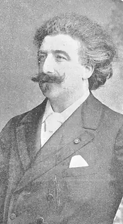 caricature of a man playing the cello; he has a large moustache and a mane of grey hair
