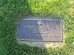 Joseph J. Cicchetti (June 8, 1923 – February 9, 1945) was a soldier in the United States Army who received the Medal of Honor in World War II during actions in the campaign to recapture the Philippines from Japanese forces in 1945. Cicchetti formed a team of soldiers to rescue wounded comrades. Despite receiving a severe wound to his head, he managed to carry another soldier to safety before succumbing to his wound.