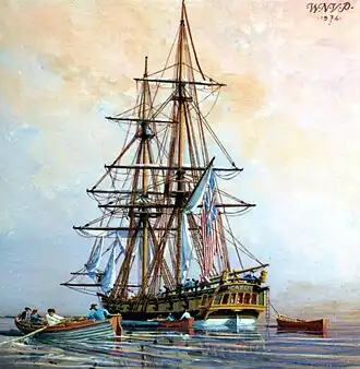 Olney had to wait until May 1778 for his next command, the Continental Navy ship USS Queen of France (1777). He took command of her at Boston and began looking for a crew.[6] By the end of 1778 he had a crew of 136 men aboard, and the ship was wooded, watered and provisioned. She dropped down to Nantasket Road to await last-minute work.[6]