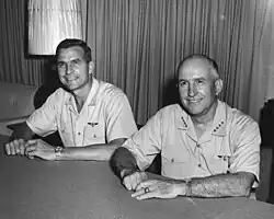 Joseph Park Moorer (October 18, 1922 – February 26, 2014) was a vice admiral in the United States Navy. Born in Mount Willing, Alabama, he was the younger brother of Admiral Thomas Hinman Moorer.[1][2] Joe Moorer graduated from the United States Naval Academy in 1941 and served in the Pacific Theater in World War II and in the Vietnam War.[1] From 1977 to 1980, he served as Commander in Chief of United States Naval Forces Europe, headquartered in London, England.[3] He retired in 1980 and died at his Florida home in 2014.[3][4]