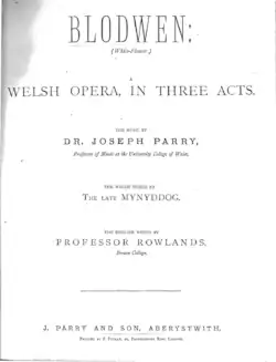 Parry's opera, Blodwen, was first performed in Aberystwyth's Temperance Hall on 21 May 1878, although Parry did not publish it until 1888, while at Swansea.[23] This was the first opera written by a Welsh composer and also the first opera to be performed in Welsh. The opera, with its libretto written by Richard Davies, is set during the time of the Welsh Revolt—the last attempt by the Welsh to preserve their independence.[73][16][23][74]