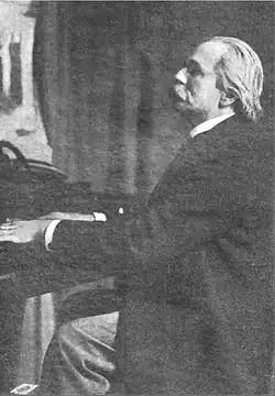 In August 1868 Parry and his family arrived in England, where he began a three-year study at the Royal Academy of Music under William Sterndale Bennett and Manuel Garcia.[7] During his last year of study at the Royal Academy, Parry appeared before Queen Victoria three times, each time by her special request. The Queen made another request of Parry each time he appeared: that he perform only works he had composed.[10] In 1871, Bennett convinced Parry to enter University of Cambridge for a degree in music.[7][17][d] While at Cambridge, Parry became the first Welshman to take both the MusB and MusD there.[1] After earning his bachelor's degree, Parry and his family returned to Danville, where he operated a school of music for the next three years.[7][18] When Aberystwyth University established a chair for music, it was offered to Parry; he moved his family back to Wales, becoming the university's first professor of music.[7][19][1][e]