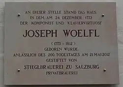 Memorial plaque at Woelfl's birthplace, donated 2012 by Stieglbrauerei