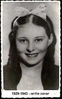 When the ghetto mass deportations to Treblinka extermination camp started, the Feldschuh family went into hiding.[3] At that time Josima contracted pneumonia which had lasting effects on her health.[4] In January 1943 the Feldschuhs escaped the ghetto with the help of Szoszana Kassower.[3] Around that time Josima was diagnosed with terminal stage tuberculosis.[4] She died on April 21 in the village of Pustelnik, where the Feldschuhs were hiding.[2] Shortly afterwards, her mother committed suicide.[1] After the war, Ruben Feldschuh moved their remains to a different location, most likely to the Jewish Cemetery in Warsaw.[1]
