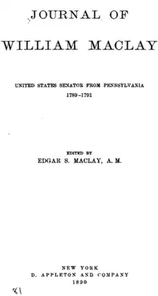 The Journal of William Maclay is a published version of a diary kept by William Maclay during his tenure as a United States Senator representing Pennsylvania, a position in which he served from 1789 to 1791.[1] Maclay began keeping the diary within two months of taking office and kept it almost daily during the 1st United States Congress. It is one of few accounts of the early United States Senate; sessions would not become open to the public until 1795.[2]
