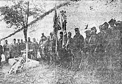 Following the outbreak of World War I, Babunski formed the Sava Chetnik detachment, which was placed under the command of Major Vojislav Tankosić.[10] The unit suffered its first casualties when Austro-Hungarian river monitors shelled Belgrade on the night of 28 July 1914, killing a 16-year-old Chetnik volunteer named Dušan Đonović, the first victim of the war. Shortly afterwards, Babunski's Chetniks destroyed a railway bridge on the Sava to prevent the Austro-Hungarians from crossing.[11] Babunski and his men returned to Macedonia in 1915 and fought Bulgarian guerrillas.[12] At the beginning of 1915 Babunski became the first Commander of the Vardar Detachment, a tactical-operational unit belonging to the Serbian Army Vardar Division, but allowed to operate independently. The formation of 1,640 members, later increased to 5,898,[13] was led by Serb officers and non-commissioned officers and composed of Macedonians soldiers.[14] The unit was located in the eastern parts of the Vardar part of Macedonia, in the area of Kratovo, Ovche Pole, Kočani,[15] assigned to secure the border against Bulgarian's incursions, often clashing with IMRO chetas.[13]