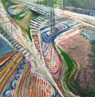 Living in the hills of Berkeley, Belzer was increasingly informed by her view of the Bay, shipyards and Golden Gate National Recreation Area, in which mountain and maritime landscapes seemed to blur with industrial outlooks and infrastructure.[3][4][15] She reimagined and reworked these scenes in her "Through Lines" (2010–12), "Edgelands" (2012–13) and "Anthropocene" (2013–4) series, sketchy panoramas that depicted abstracted freeways, refineries, bridges and parking lots intersecting and jostling against fields, marshes and organic forms.[15][2][30] San Francisco critic Jonathan Curiel wrote of the latter series, the "work is an explosive torrent of colorful wiggles, swirls, triangulations, crests, gradations, and vistas that are aerial maps of Belzer's active imagination … [her] canvases capture this crazy quilt of connected parts, all from distorted bird's-eye perspectives and all with an artistic energy, playfulness and freneticism."[2]