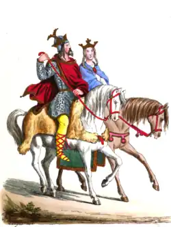 On the way back, in 856, he stayed at Charles' court again, and married Judith on 1 October 856 at the royal palace of Verberie-sur-Oise. This was an extraordinary event as Carolingian princesses rarely married and were usually sent to convents. It was practically unprecedented for them to marry foreigners.[5][6] During the ceremony, which was celebrated by Hincmar, archbishop of Rheims, the bride put on a wedding ring and was presented with magnificent gifts. As a part of the ritual, Judith was crowned and anointed with myrrh. Æthelwulf honoured his bride by calling her queen after the ceremony.[7][8] According to the customs of Wessex, the wife of a king could not be called queen or sit on the throne with her husband.[9] However, all chroniclers pay attention to the fact that Charles the Bald insisted on the coronation of his daughter,[10][11] probably wishing to secure her position in her new home:[12]