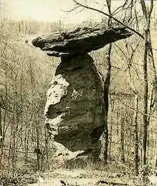 In the Second Report of the Geological Survey of Indiana, published in 1871, State Geologist E. T. Cox wrote: One of the most interesting spots to visit, for obtaining a view of this character of scenery, is near the town of Shoals, on the road to the Indian Sulphur Springs. A high ridge of millstone grit, here, terminates within a few yards of the East Fork of the White River, from the top of which, there is a projecting mass of conglomerate sandstone, called the "Pinnacle," which stands one hundred and seventy feet above the level of the stream. Cyclopean blocks, that have broken off, lie around the foot of the ridge, in every conceivable position. On the north side of this ridge, the conglomerate has been cut through by disintegrating forces, which left, at some distance from the main ledge, a tall mass of rock, which has received the name of "Jug Rock," from the fancied resemblance which it bears to a jug. It is forty-two feet high and supports, on its top, a flat projecting layer, which is called the "stopper." Just above the bulge of the jug are irregular lines of stratification, known as false bedding. The lower part is thickly set with quartz pebbles. The frontispiece to this volume presents a view of the "Jug Rock" which was copied from a photograph taken by D. Allbright. For this faithful representative of a highly interesting geological scene, I am indebted to B. F. Devol, and D. Allbright, of Shoals.